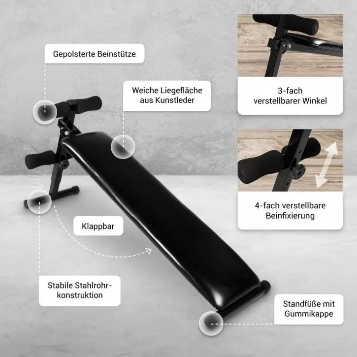 Compra en Decathlon Banco Abdominales Gorilla Sports Negro Capacidad de Carga 120 Kg Ideal para un Entrenamiento Intensivo de los Músculos Abdominales.Ofrece un ángulo ajustable en tres direcciones. Capacidad de carga máxima de 120 kg