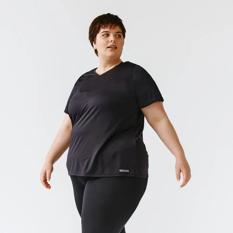 Compra en Decathlon Camiseta running manga corta transpirable talla grande Mujer Dry Hemos creado esta camiseta para ofrecerte una buena gestión del sudor y comodidad en tus movimientos durante tus salidas de running de bienestar.